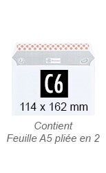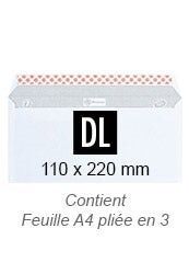 • Les enveloppes DL (110 x 220 mm) et C5/6 (114 x 229 mm) peuvent recevoir elles aussi du A4 (plié en trois). Notez que le format DL est le plus utilisé au monde mais qu’il se fait de plus en plus remplacer par les enveloppes C5/6 qui sont un peu plus grandes.