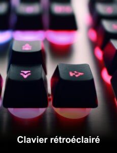 Ce type de clavier est doté de petites LED placées sous les touches qui s’illuminent. Souvent, ces claviers peuvent être paramétrés via un logiciel gratuit fourni par les fabricants (en téléchargement), qui permet d’adapter les couleurs et le type de rétroéclairage.