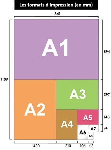 Pour comprendre la dénomination des formats d'impression et savoir les reconnaître en un coup d'œil, il suffit de les imbriquer entre eux. On remarque alors que la largeur d'un format devient la longueur du format suivant. Pourquoi ? Tout simplement car les formats d'impression A sont basés sur le principe d'homothétie : leurs proportions sont conservées lorsque l'on plie le plus grand côté de la feuille.