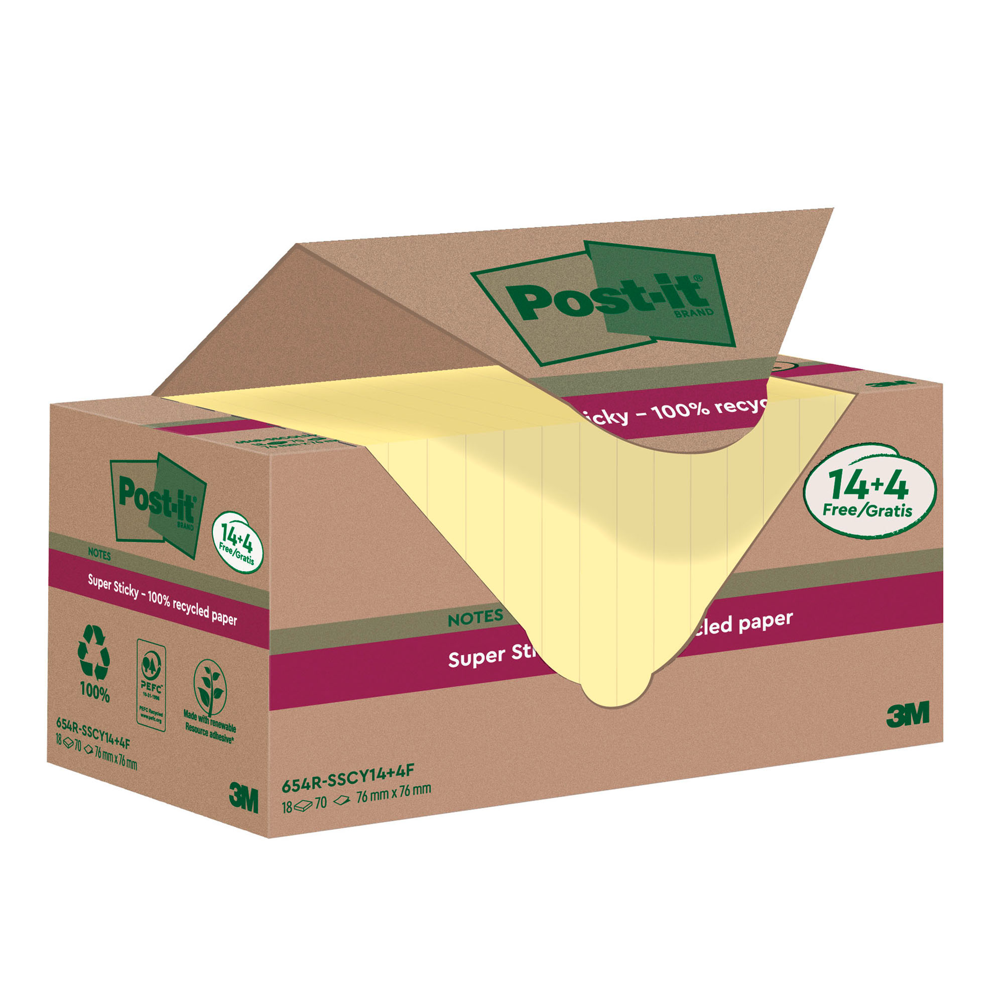 These repositionable notes are certified PEFC RECYCLED and come from certified, renewable, responsibly managed forests. They feature an adhesive made up of 60% of a renewable resource, namely a plant that regrows annually. The packaging made from recycled cardboard can be used to easily store your repositionable notes in your office or closet, and then recycled when you no longer need them.