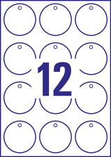 Diamètre: 60 mm, rond, blanc, satiné, bords entièrement lisses, peut s'imprimer recto-verso, pour imprimante laser, blanchi sans chlore, contenu: 120 pièces sur 10 feuilles A4