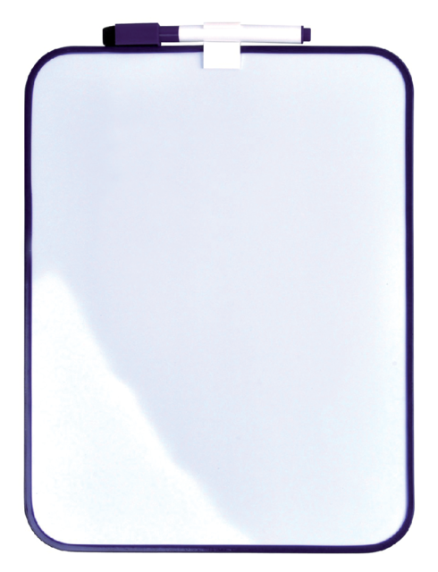 Detailled description* Ardoise/tableau mémo pratique 21,5x28cm avec angles arrondis et un profil fin en plastique (violet). * Magnétique, inscriptible et effaçable. * Livrée avec marqueur + capuchon effaceur sur clip et kit de montage.
