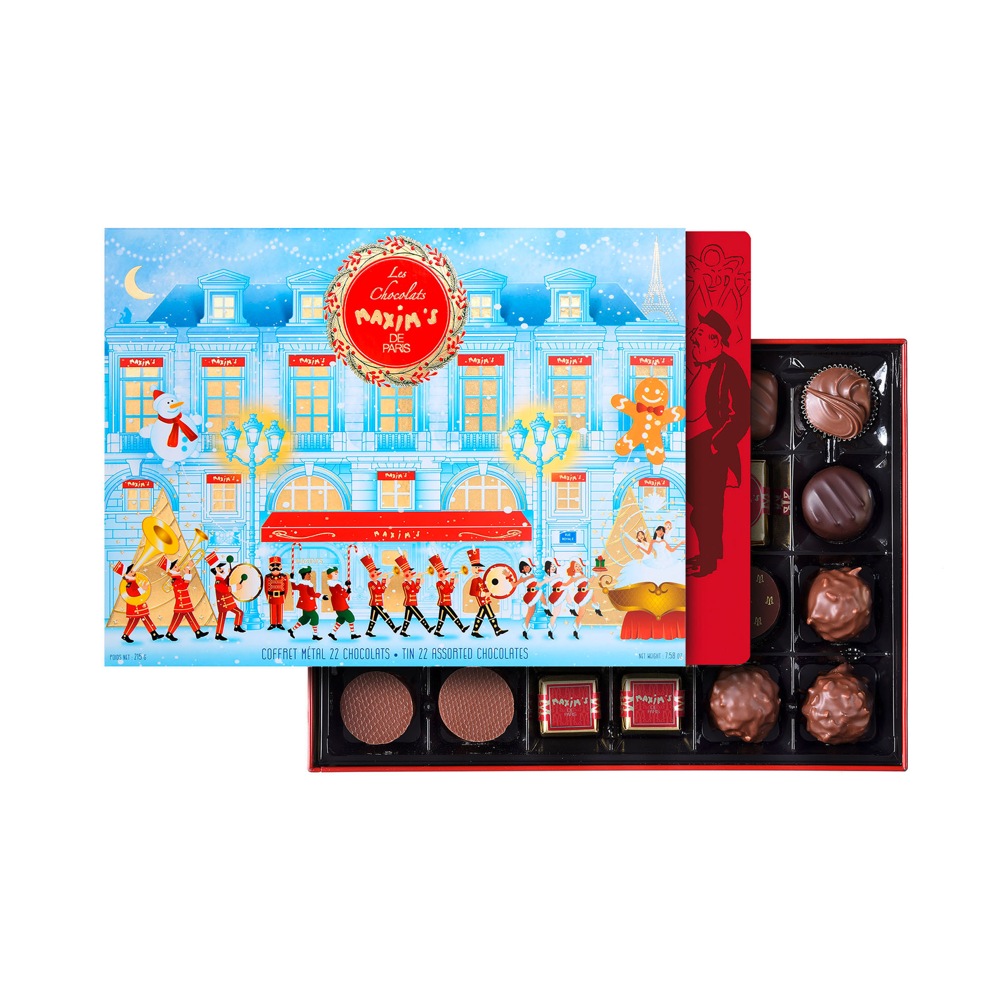 Detailled descriptionElegant basket in metal, with assortment of 22 chocolates (black, milk, praline, ganache,...).