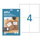 4 labels per sheet. 10 A4 sheets. Size of 1 label 105 x 148 mm, right angles, permanent glue.