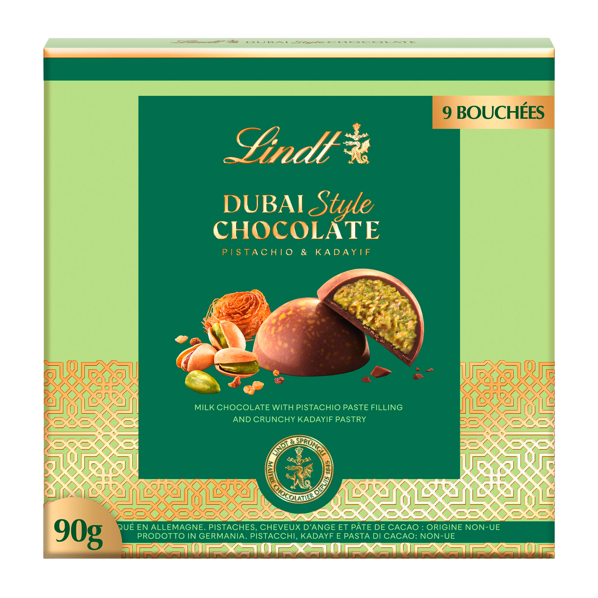 Each bite combines the creamy milk chocolate from Lindt's Master Chocolatiers with a refined filling blending creamy pistachio and crispy angel hair (kadaïf).