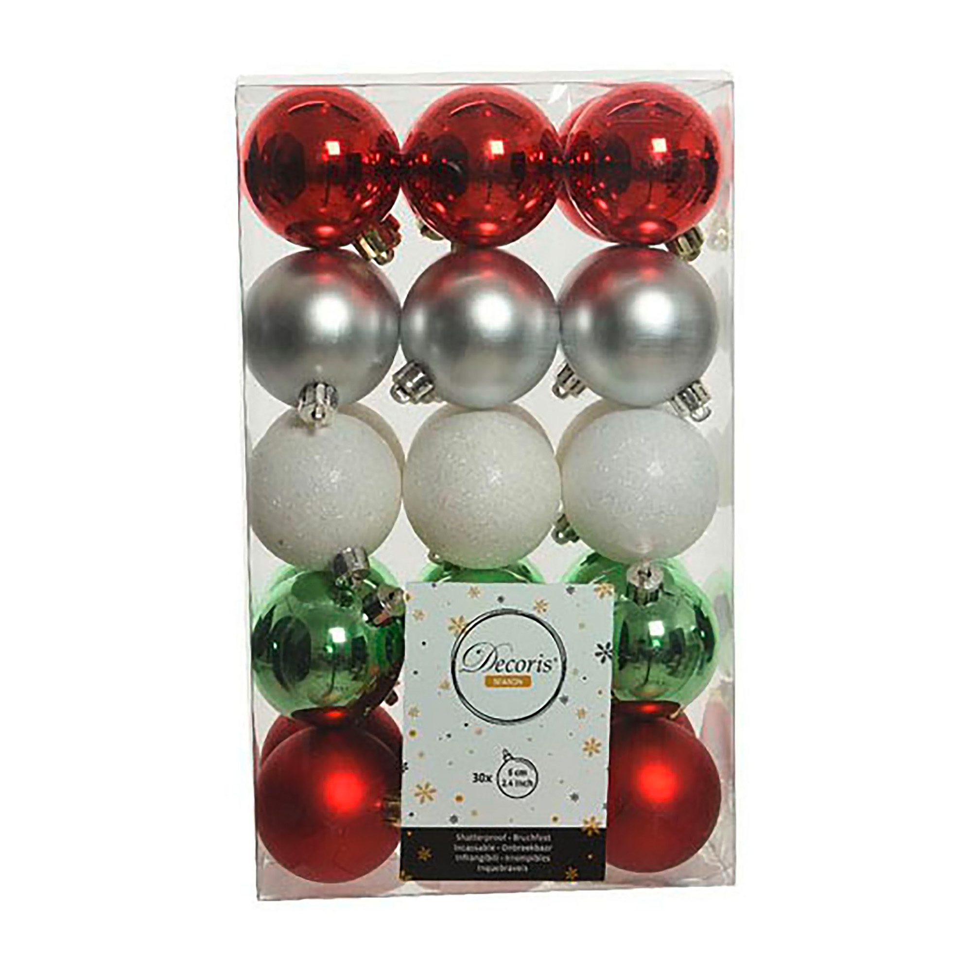 Detailled descriptionIdéales et incassables pour décorer votre sapin ou votre environnement !IncassablesBoîte de 30 boules Composée de 6 boules mats or, 6 brillantes rouge, 6 pailletées blanc, 6 brillantes vert, 6 mats rougesØ 6 cmFil doré pour les suspendre.
