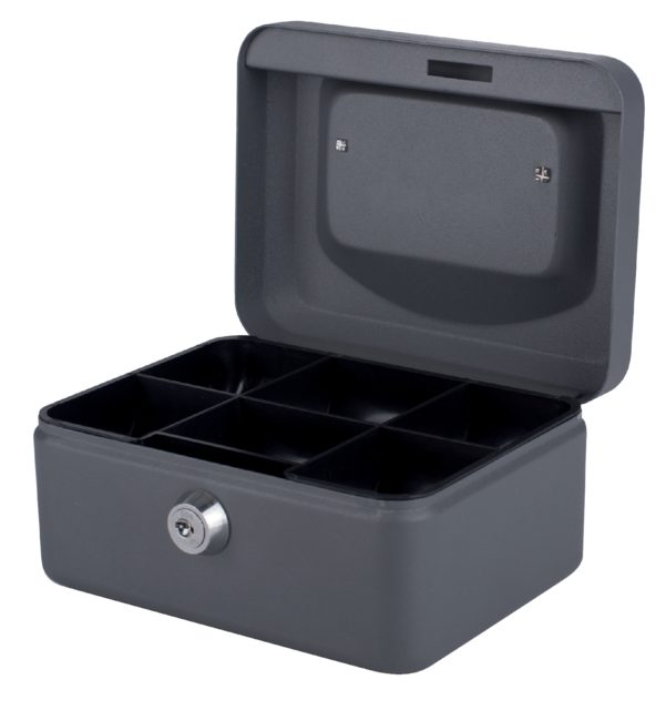 Detailled descriptionEn acier robuste, fermeture à cylindre de sécurité avec 2 clés, poignée escamotable, compartiment pour pièces de monnaie inclus, avec 6 compartiments