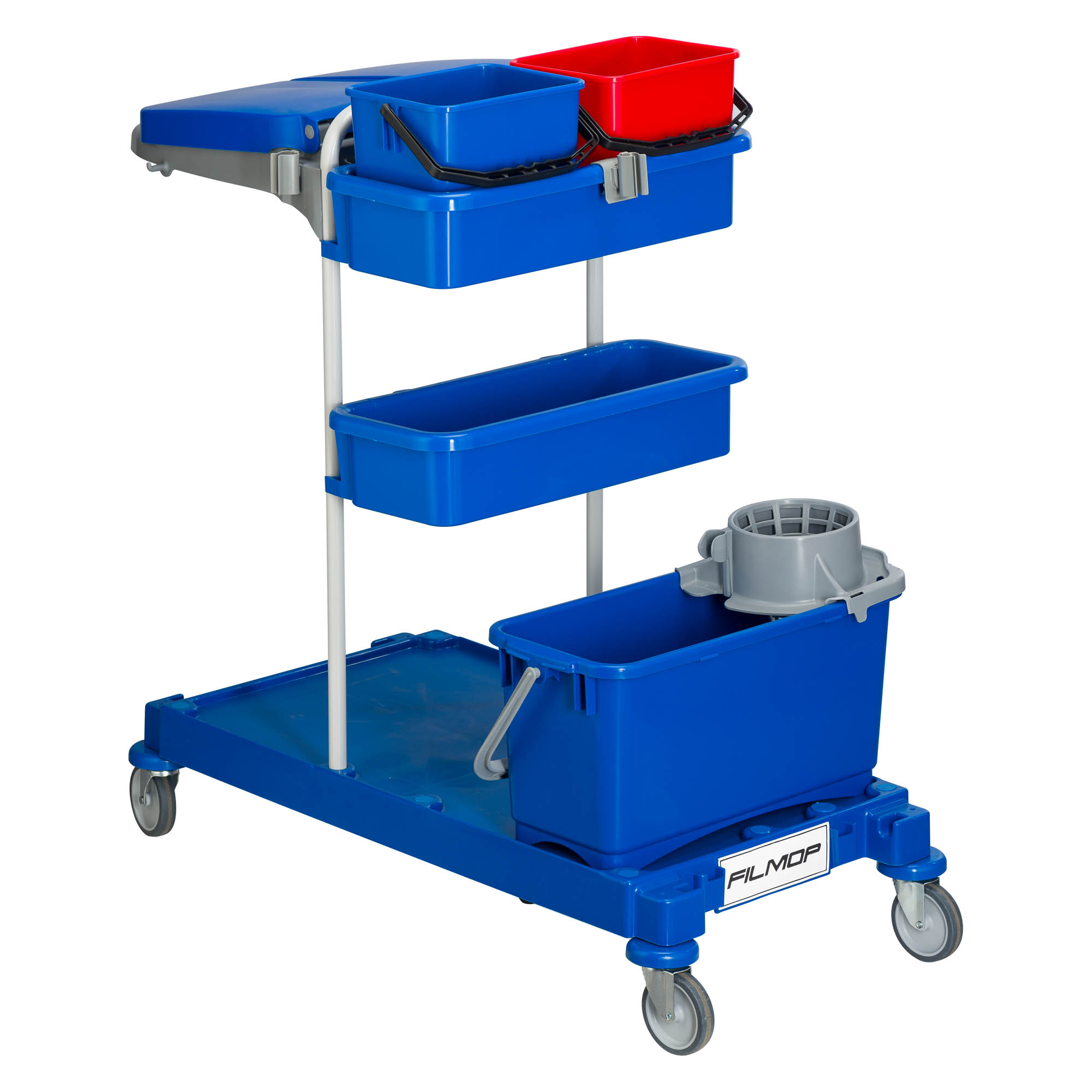 Detailled descriptionChariot de ménage, lavage pour le ramassage des moyennes et hautes surfaces, lavage des sols et nettoyage des surfaces hautes.Base en polypropylène et métal Rilsan 95 x 53 cm. 2 bacs latéraux 50 x 19 cm, 1 support sac 110/130 L, 1 seau bleu 20 L avec essoreur Faubert.2 seaux de 6 L (bleu, eau propre / rouge eau sale), 1 support manche 22 mm, 5 roues standards, 4 rondelles pare-chocs.Dimensions : L 102 x P 53 x H 107 cm.Ce produit est écoresponsable car il a été fabriqué à base de 45 % minimum de matériau recyclé.