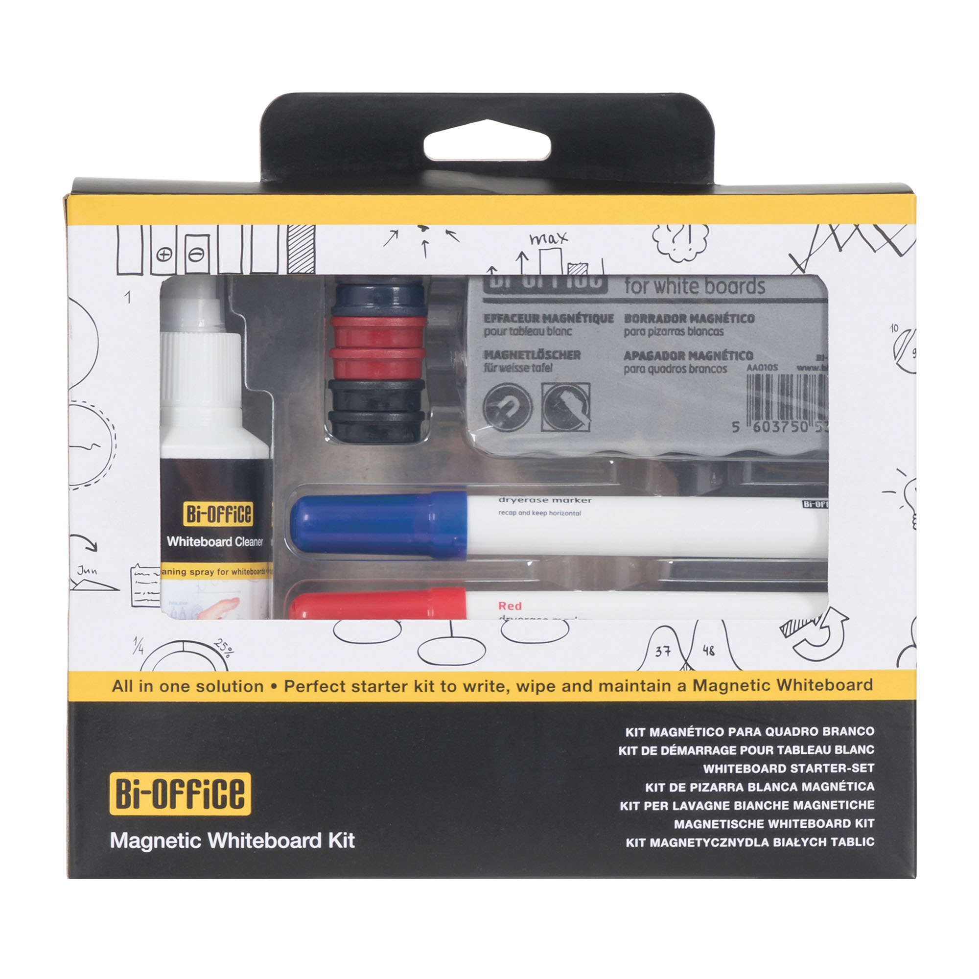 Detailled descriptionAn essential kit to use with any whiteboard.It includes: 4 markers in black, red, blue, and green6 magnets1 magnetic eraser125 ml of spray cleaner