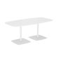 Melaminated table plate thickness 22 mm, with anti reflection and anti scratch treatment, white or light oak. Rounded corners. ABS antishock band, colour assorted with table plate. 2 steel legs thickness 6 mm with square base 58 x 58 cm, epoxy white satinated finishing, scratch resistant.