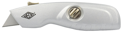 Detailled descriptionLame à ressort - se rétracte automatiquement, boîtier légerzinc et aluminium avec magasin pour lames, pour droitiers &gauchers, livré avec 2 lames de rechangedimensions: (L)151 x (P)26 x (H)44 mm