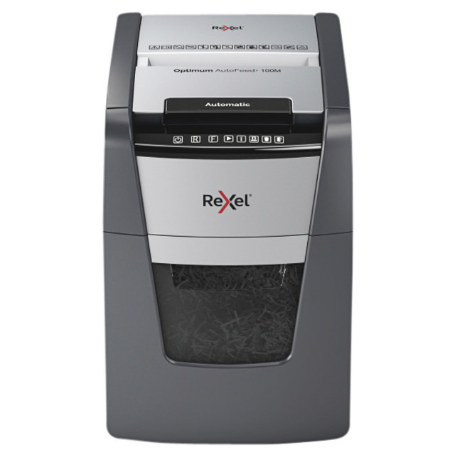 The Optimum Auto+ 100M P-5 shredder offers a shredding capacity of 100 sheets per pass, thanks to its auto-feed function. It also destroys credit cards, staples, and paper clips, allowing you to save time and increase efficiency.