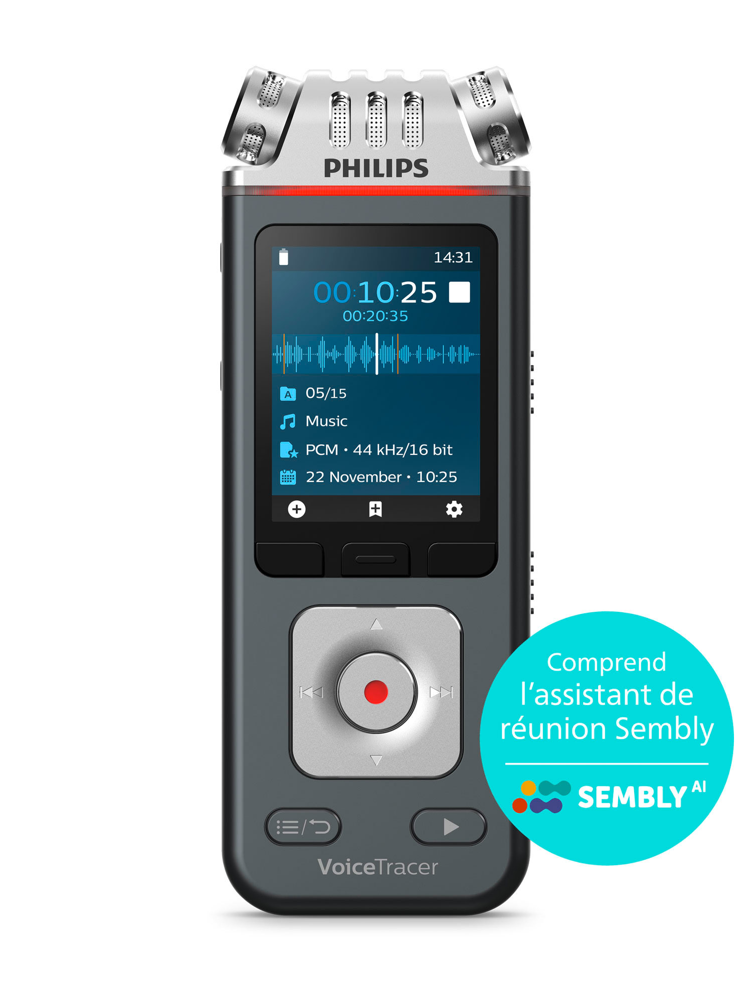• Grand écran couleur pour des informations claires sur le statut de l’enregistrement