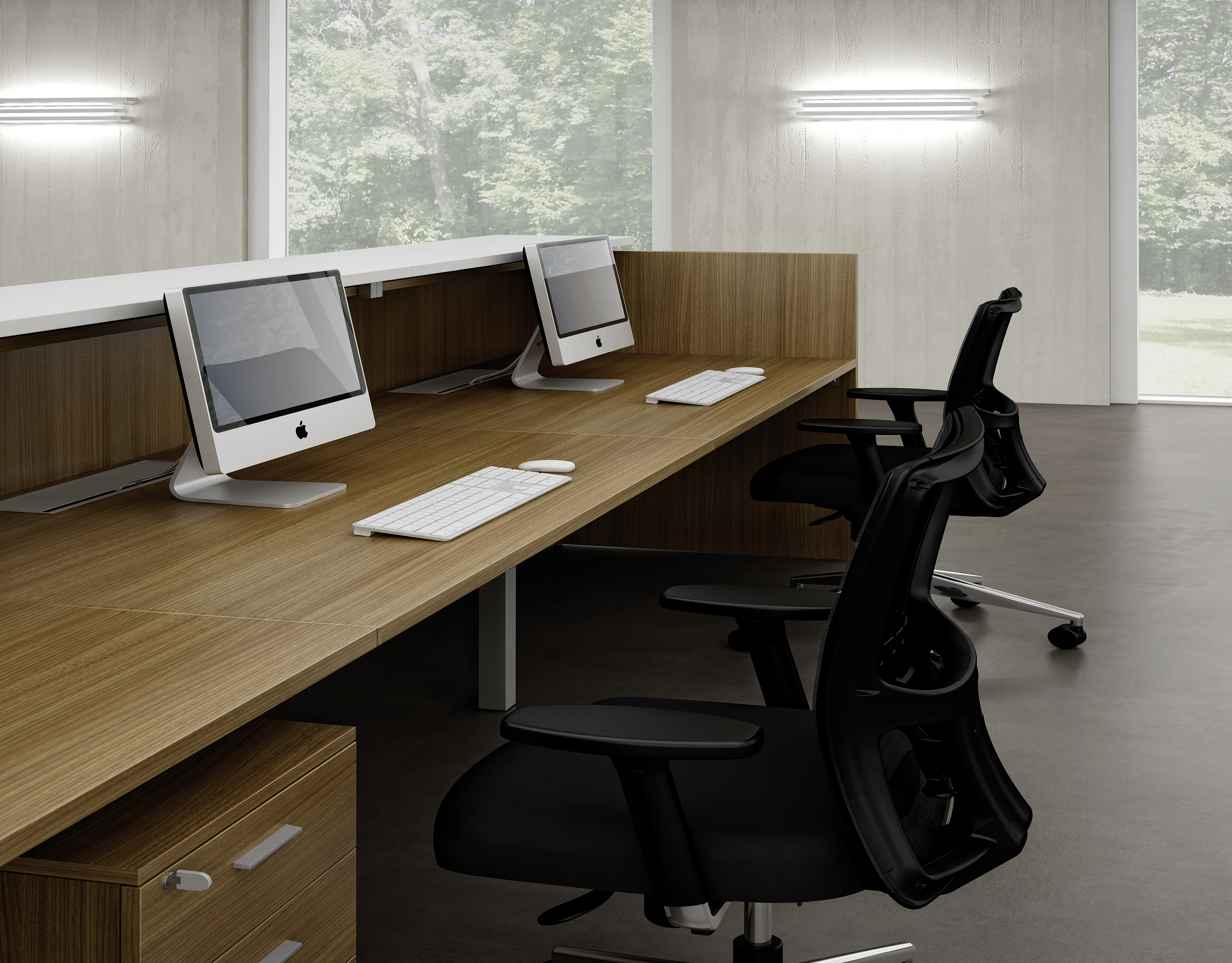 Designed in 2 tones, this furniture is composed of 2 or 3 white or walnut decor shelves and 1 or 2 counters formed from a large anthracite or white shelf depending on the width. You have the choice between 2 widths: 246 or 366 cm.