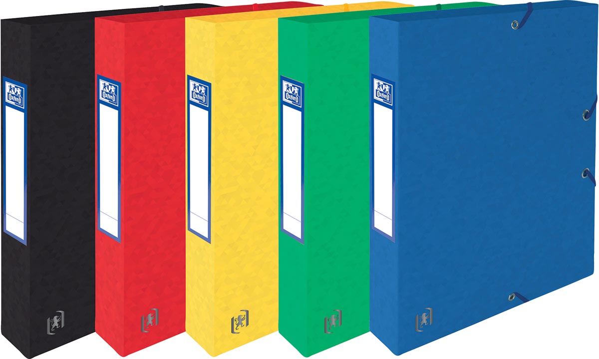 Detailled descriptionOxford Top File+ boîte de classement. Pour ft A4 (24 x 32 cm). En carton de 390 g/m². Avec 3 rabats et élastiques. Avec etiquette de dos. Certifié PEFC.