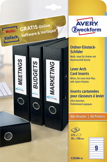Detailled description* Etiquettes dorsales à insérer pour classeur à levier. * Imprimable. * L’étiquette est entièrement unie, donc vous pouvez les personnaliser complètement. * Convient aux photocopieurs. * Modèles et logiciel gratuits sur avery.eu