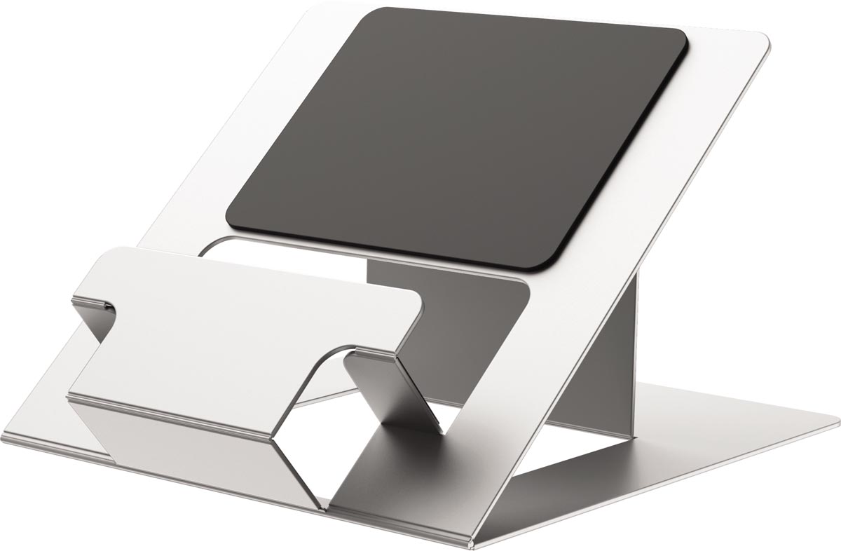 En plastique HYLITE® Elève votre ordinateur portable à un angle de vue confortable 6 réglages en hauteur Se plie entièrement à plat Avec pochette de rangement qui peut être utilisée comme tapis de souris Capacité max.: 4 kg Ft 23,8 x 24,6 x 0,6 (l xp x h) Couleur: argent
