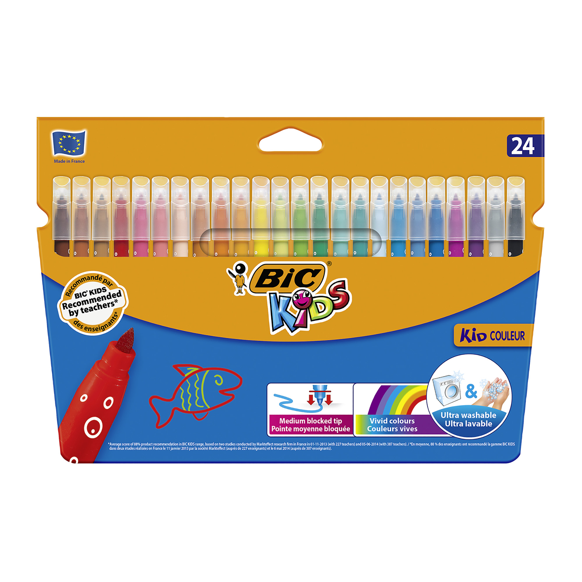 Ces 24 feutres BIC Kids Kid Couleur se déclinent en 24 tons vifs et lumineux. Ils ont une encre ultra lavable à base d'eau, facile à enlever de la peau et la plupart des tissus. Leur pointe moyenne est bloquée, pour ne pas s'enfoncer à la pression sur le papier. Ils sont adaptés au quotidien des enfants dès 5 ans.