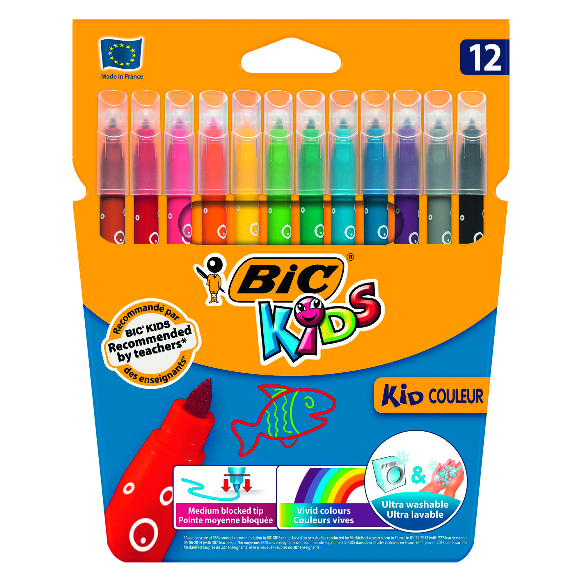 Colored body mit pattern of a soap bubble. Translucent cap with ventilation channels. Water-based ink, washable on skin or fabric. Vivid colours. Blocked medium point 2,8 mm. 2 assorted colours. Made in France. Age: starting from 5 years.