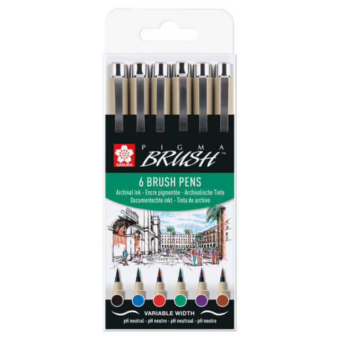 * Que vous dessiniez, fassiez des croquis ou peigniez, avec ces feutres pinceaux Sakura Pigma, vous pourrez donner libre cours à votre créativité. * L'encre Sakura Pigma, unique en son genre, ne traverse pas le papier et est permanente, imperméable, à séchage rapide, à PH neutre et ne coule pas. * Le set de feutres pinceaux Pigma contient 6 pointes de pinceaux flexibles qui reprennent facilement leur forme initiale après utilisation. * Le set contient 6 feutres pinceaux dans les couleurs brun (12), rouge (19), violet (24), vert (29), bleu (36) et noir (49).