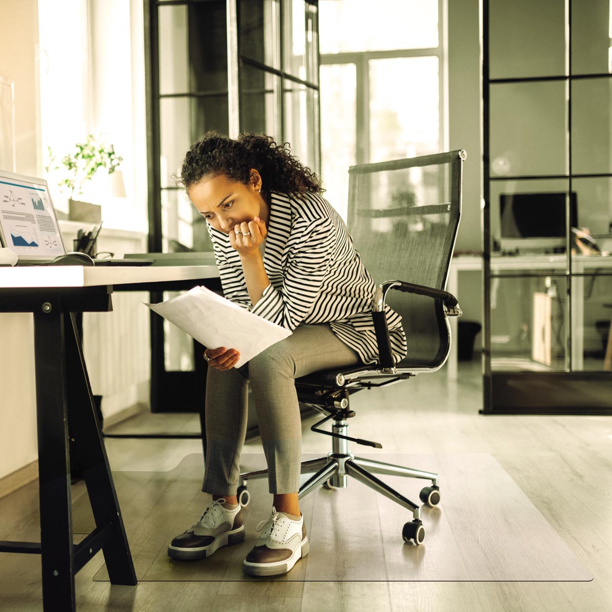 Detailled descriptionEn PVC Protège le sol contre des dommages de roues de chaises de bureau Avec entaille Contient jusqu'à 25 % de matériaux recyclés, produit avec jusqu'à 30 % d'énergie renouvelable Ft 120 x 90 cm