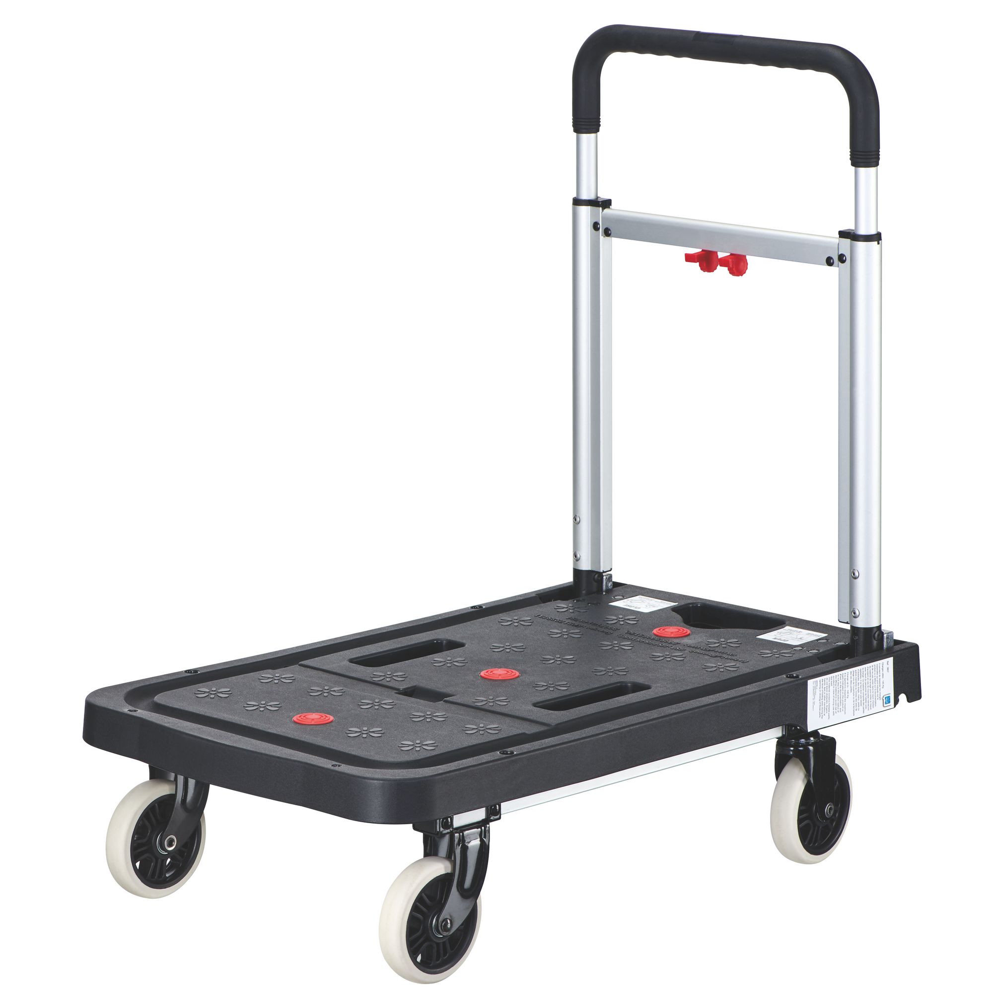 2 fixed wheels and 2 castors, foldable for a real saving of space.