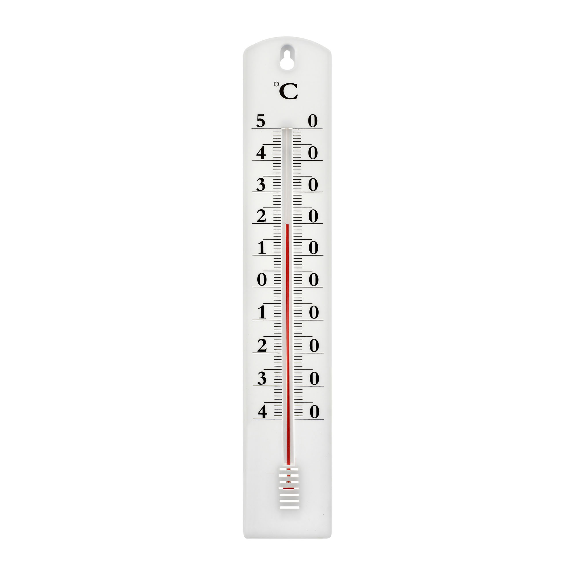 Detailled descriptionThermometer for indoor and outdoor use.Made of plasticProtected glass tubeLiquid: keroseneTemperature in degrees Celsius: -40°C to +50°CDimensions: 39.5 cm X 6.2 cm.