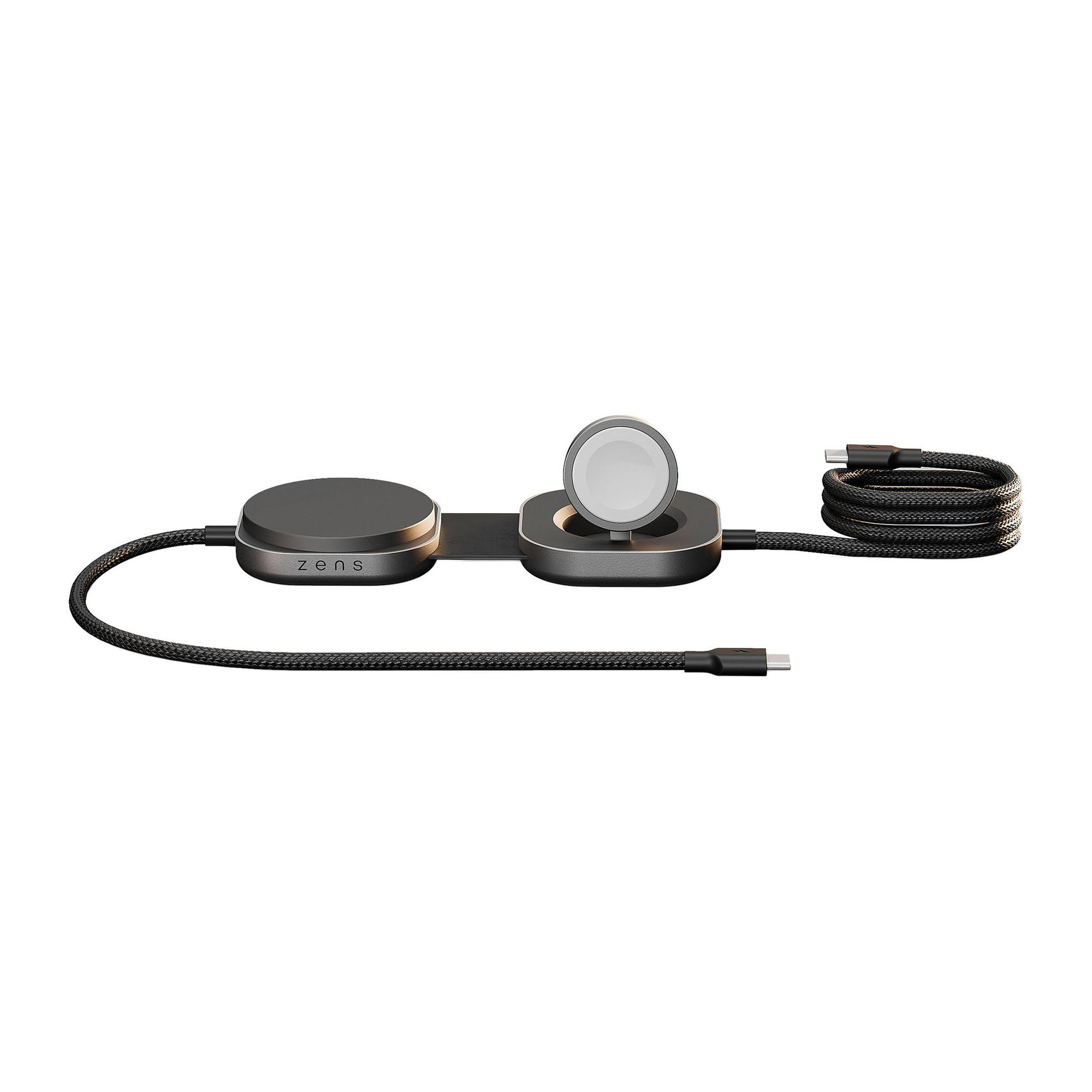Make your work and travel easier with the Zens Charging Cable USB C-C Pro 3. This cool 3-in-1 cable charges your laptop or any USB-C device while wirelessly charging your iPhone (12 and newer), AirPods, and Apple Watch at the same time: no need for multiple large adapters anymore. The cable is Qi2-certified and offers 15W fast wireless charging for your iPhone or AirPods and 5W for your Apple Watch, keeping all your essential devices charged. The cable is made of high-quality aluminum and features a foldable and compact design, making it perfect for daily commutes, hybrid working, or international travel.
