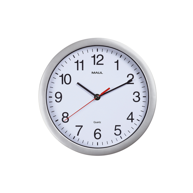 * Horloge murale à Quartz, modèle de base pour les consommateurs économes. * Dotée d’un mouvement à quartz allemand. * Diamètre : 25,2cm. * Aspect moderne et élégant pour le bureau ou la maison. * Cadre argenté en plastique résistant. * Cadran blanc avec division de heures et des minutes en noir. * Hauteur des chiffres : 23mm, avec division heures et minutes. * L’horloge est facile à lire, même à distance. * Horloge murale doté d’un mouvement rotatif silencieux. * Horloge murale avec finition en verre minéral sur le cadran. * 905 25 : synchronisation automatique avec l'émetteur de Francfort DCF77, réglage automatique de l'heure d'été et de l'heure d'hiver. * Alimentation par pile 1,5V (AA) incluse. * Fixation murale facile grâce à l’œillet de suspension. * A utiliser dans les bureaux, salles communes et de réunion, accueil, atelier ou à la maison. * Trotteuse glissante.
