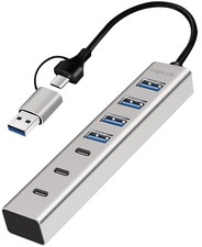 Detailled descriptionEntrée 1: câble 2 en 1 avec USB-A/USB-C mâle (150 mm), entrée 2: USB-C femelle pour l'alimentation externe, sortie: 4x USB-A femelle / 3x USB-C femelle, boîtier en aluminium, dim.: (L)23 x (P)122 x (H)16,5 mm