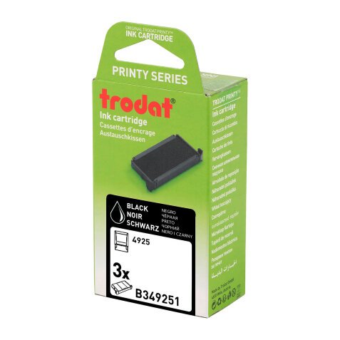 L'encre est indélébile selon les critères de la norme DIN ISO 14145-2. Le conditionnement des cassettes d'encre est fabriqué en carton recyclé et 100 % recyclable pour un impact environnemental réduit. Cassette d'encrage de rechange pour tampons à encrage automatique Printy 4925 et 4925 Typomatic.