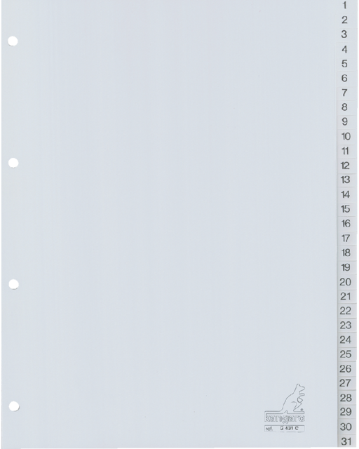 Detailled description* Intercalaires en PP g 120 mµ. * Les onglets sont imprimés de numéros en noir d’un côté. * Emballé par set sous cellophane.