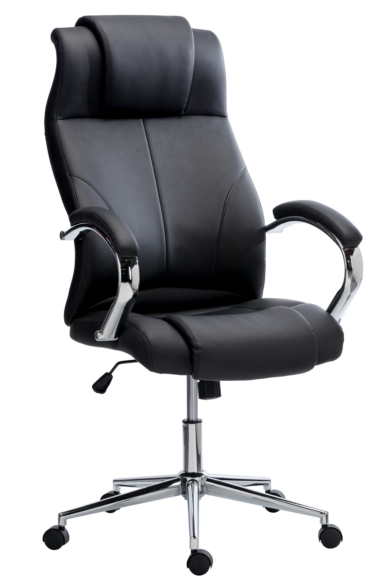 Detailled descriptionThe Dwayne executive chair combines comfort, generous dimensions and the enveloping feeling of leather. Mechanism:Chair with center-tilt mechanism: Backrest and seat are connected and tilt in one piece during a backward movement.Height adjustable from 48 to 57 cmBackrest:Faux leather upholsteryPadded backrestContoured backrest for optimal back supportBackrest density: 25 kg/m3Seat:Wooden structure covered with 60 mm thick foamSeat density: 25 kg/m3Inlay with central padding for added comfortHeadrest:Padded and integrated into the backrestArmrests:Fixed armrests with padding covered with faux leatherLegs:5 branches, in chrome finish metal, Ø 70 cmCastors:Nylon castorsIdeal for carpet and soft floor