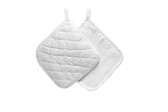 Detailled description* Maniques carrées molletonnées, 100% coton, avec boucle de suspension. * Un seul côté matelassé. * Dimensions : 20x20cm. * lot de 2 maniques, à customiser.