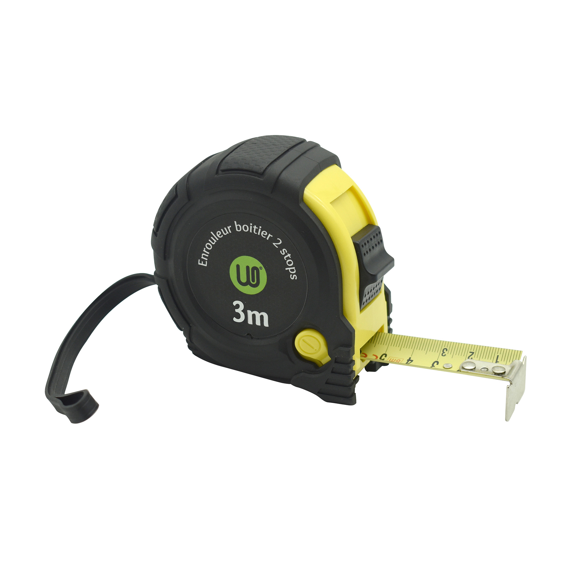 Detailled descriptionWith lip for unwinding the tape, allows you to measure up horizontally or vertically. With blocking system for the band. Body in plastic. With hook, for attaching the measuring tape to your belt. Length: 3 m.