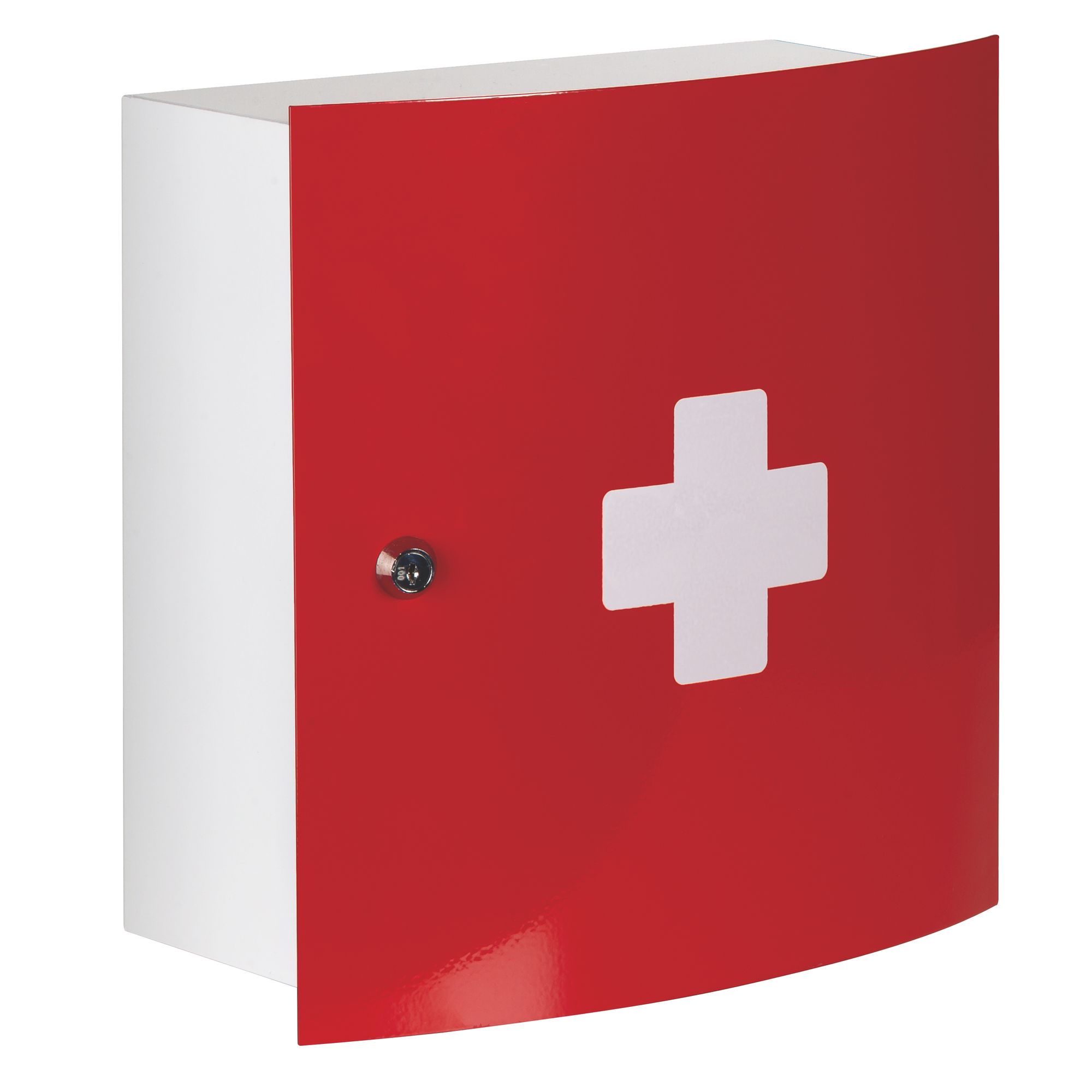 Detailled descriptionEmpty medicine chest with single door, in red metal. Closure with key (2 keys delivered).Dimensions: 32 x 32 x 15 cm.