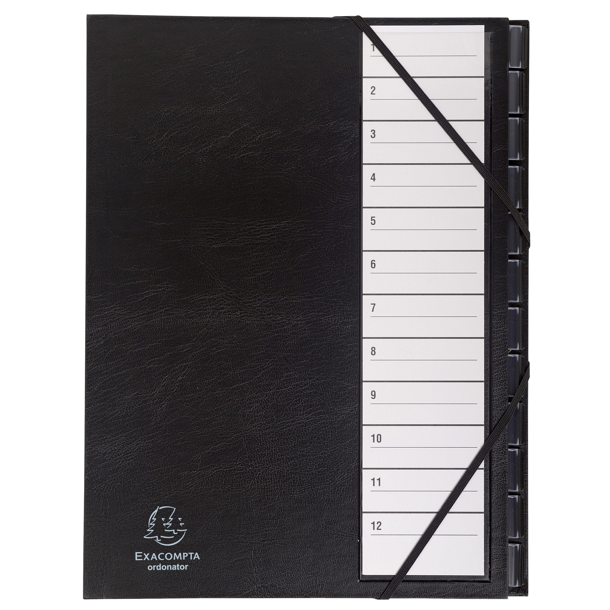 Detailled descriptionMultipart file Ordonator with elastic straps 12 numerial tabs from 1 to 12 - A4 - Black