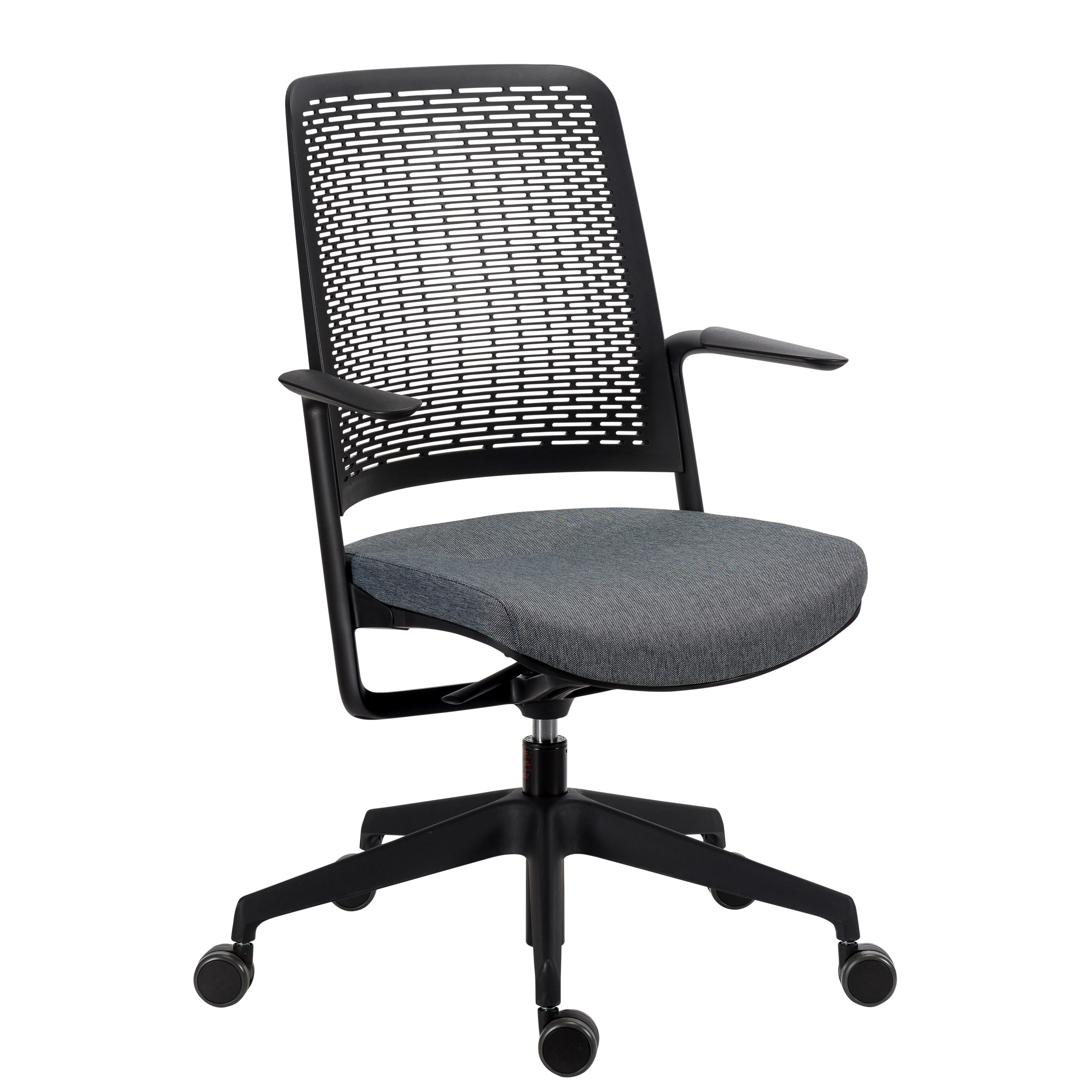 Detailled descriptionWillo is perfect for meeting rooms, agile workspaces and also suitable for home offices.The Willo office chair is unique. Thanks to its intelligent materials, there is no need to pull, turn or press levers. Just sit down and get to work.Mechanism:Equipped with synchronous and self-regulating mechanismWith automatic backrest returnSeat:The seat is upholstered and has a plastic shellMaximum supported weight: 110 kgBackrest:Its perforated backrest allows your back to breathePolyamide materialArmrests:Fixed black polyamide armrests with black polypropylene coatingBase:5-branch black polyamide base, Ø 710 mm60 mm versatile casters, for carpets and hard floors.Environment: Made from recycled materials (4.30%) Recyclable product at 99.26%Need a variation? Colours, sizes, dimensions, range extensions, accessories... More choice with the MyBruneau team I formulate my request.