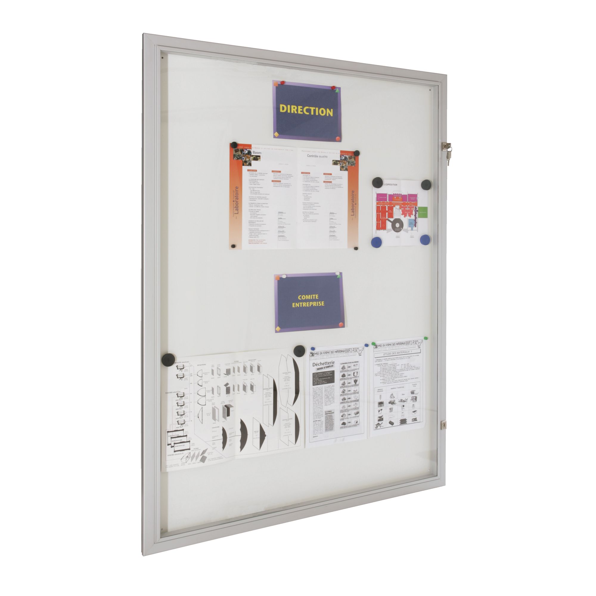 Anodised aluminium frame, 4.5 cm thickSafety glass, 4 mm thick. Light grey metal sidesSwinging doors with lock. Anodised aluminium door frame. Can be placed at the left or the right hand side. Screws included. 4, 8 and 9 page models: 4 mm thick safety glass12 and 18 page models: unbreakable plexiglass18 page model: opens downwards, with door support