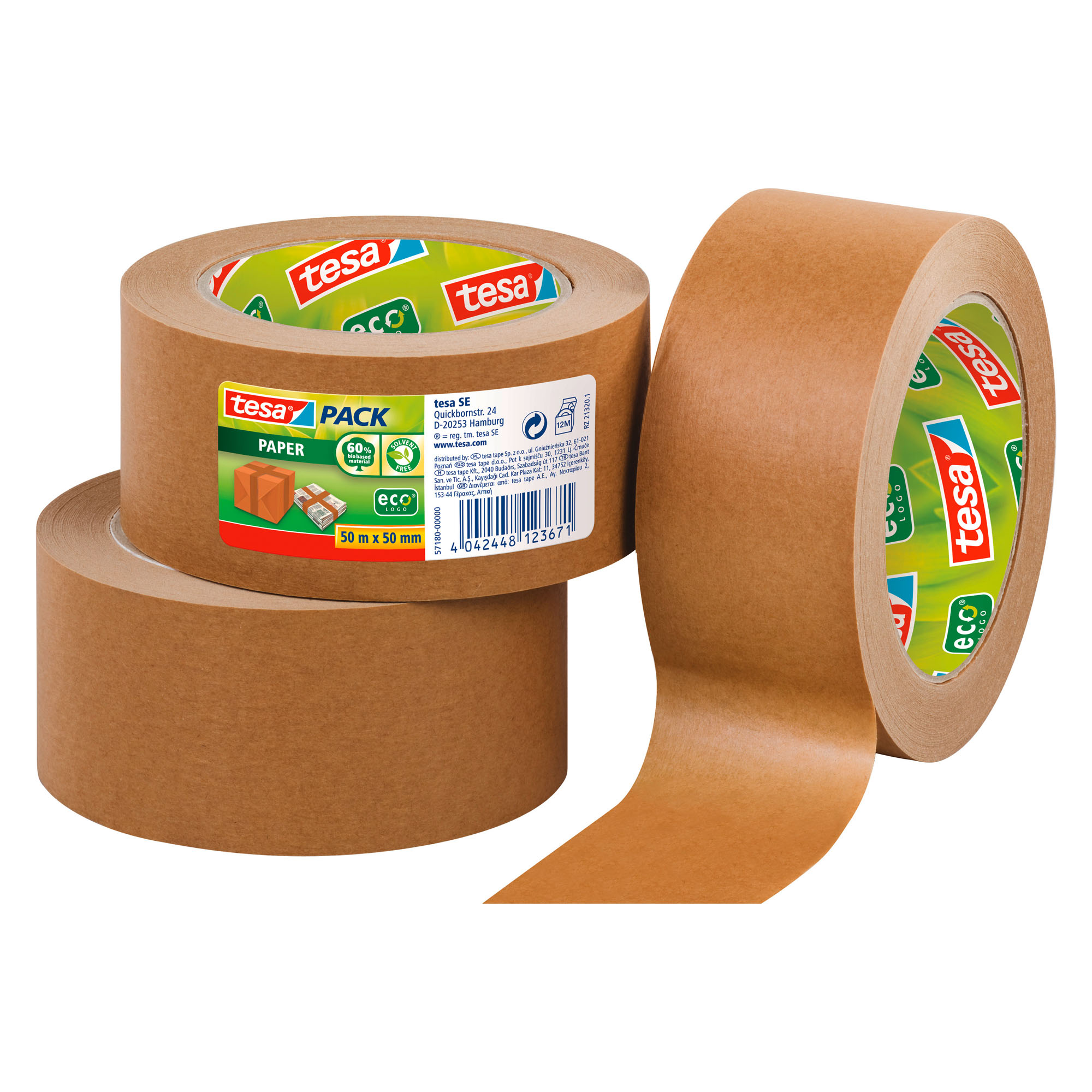 The Tesa 4313 packaging adhesive tape is a premium tape with a paper backing, a silicone-free separation layer, and a solvent-free synthetic rubber adhesive mass.