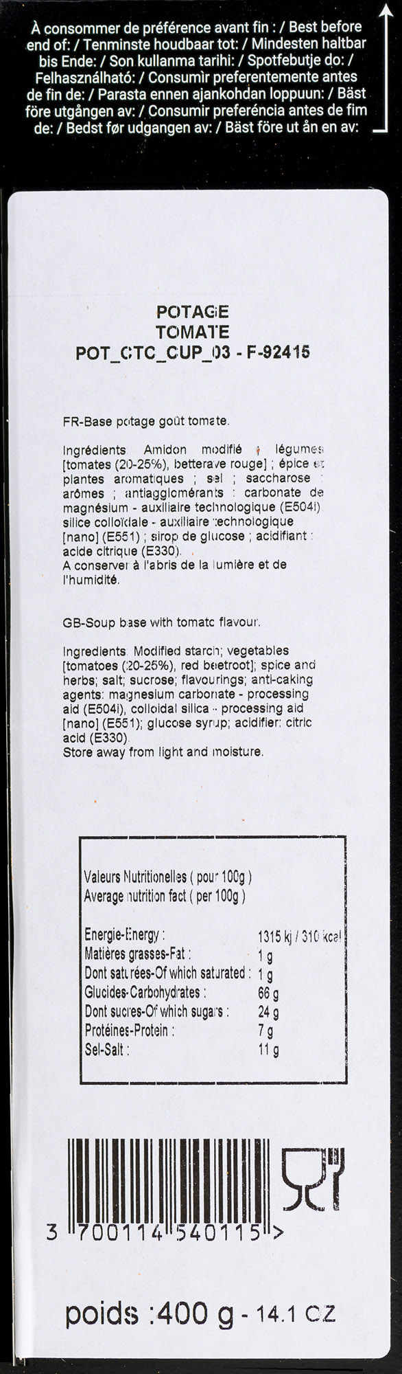 Detailled descriptionTomato soup. Contains up to 53 doses.High-quality freeze-dried products (Nestlé, Van Houten, Maggi…) in disposable hermetic cartridges with incorporated measuring device. Specific for JEDE drinks vending machine.