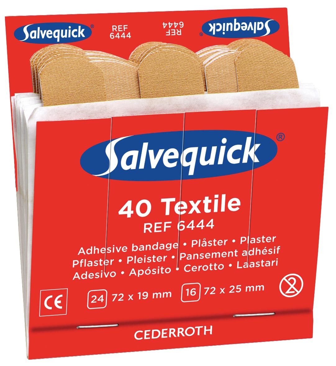 Detailled description* Recharge de pansements textile Salvequick (6444) avec 6 cartes de 40 pansements pour un distributeur Salvequick. * Les pansements laissent passés l’air et sont emballés à l'unité. * 24 pièces 72mmx19mm, 16 pièces 72mmx25mm. * Boîte de 6 recharges.