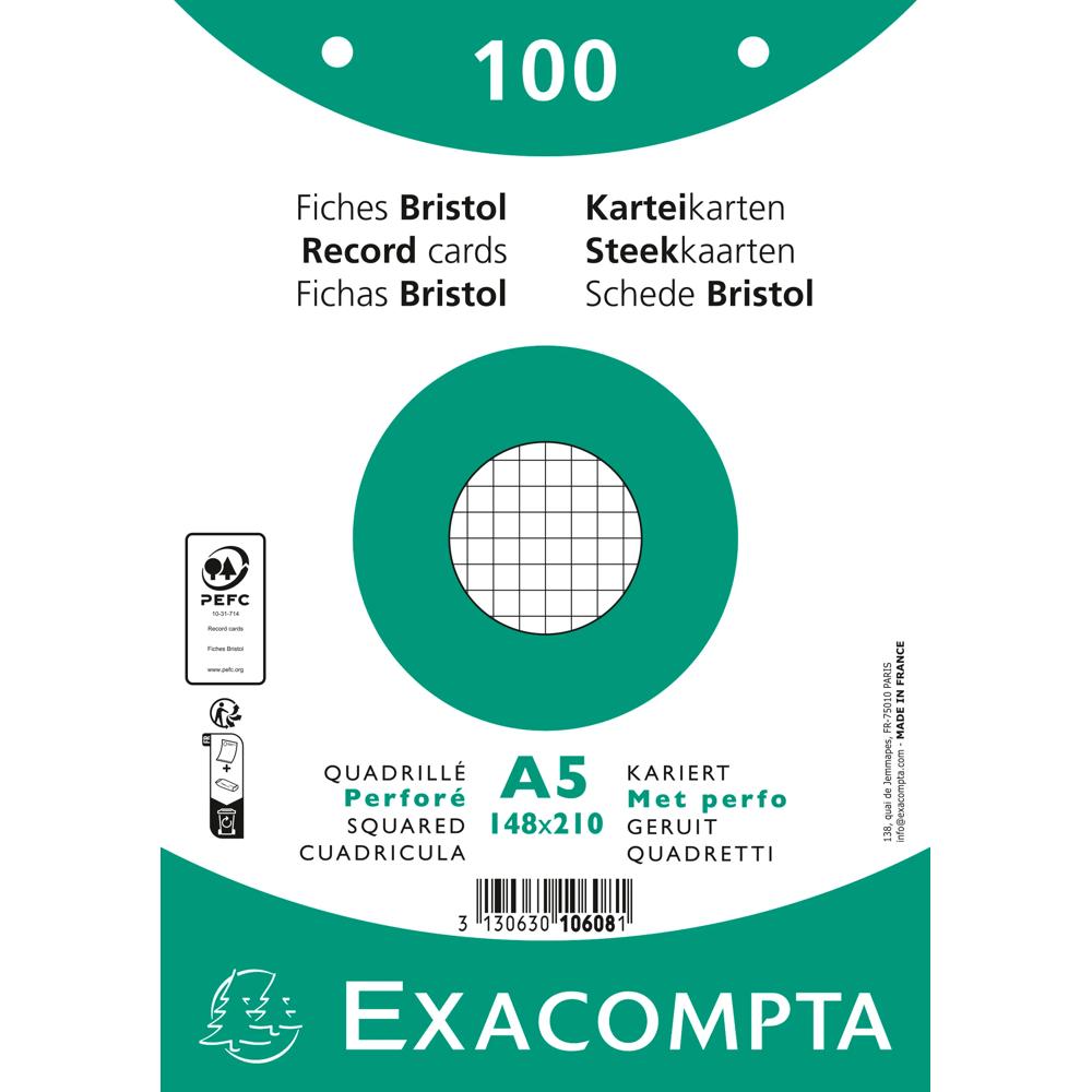 Record Cards Pack 100 White 148x210 Punched Squared Exacompta Bristol record cards and made from Clairefontaine paper which is compatible for inkjet and laser printing and photocopying 100 cards shrink-wrapped Pack 10 Weight 205gsm
