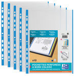 Faites l'expérience d'une organisation optimale de vos documents avec le sachet de 10 pochettes perforées Oxford à bande et bords colorés A4. Grâce à leur polypro lisse d'une épaisseur de 9/100ème, ces pochettes bleues garantissent protection et durabilité à vos papiers.
