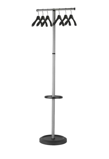 Detailled descriptionPorte-manteau vertical Fabriqué en acier chromé de haute qualité Avec porte-parapluie 6 cintres noirs inclus Ft 50 x 35,5 x 173 cm Couleur: noir