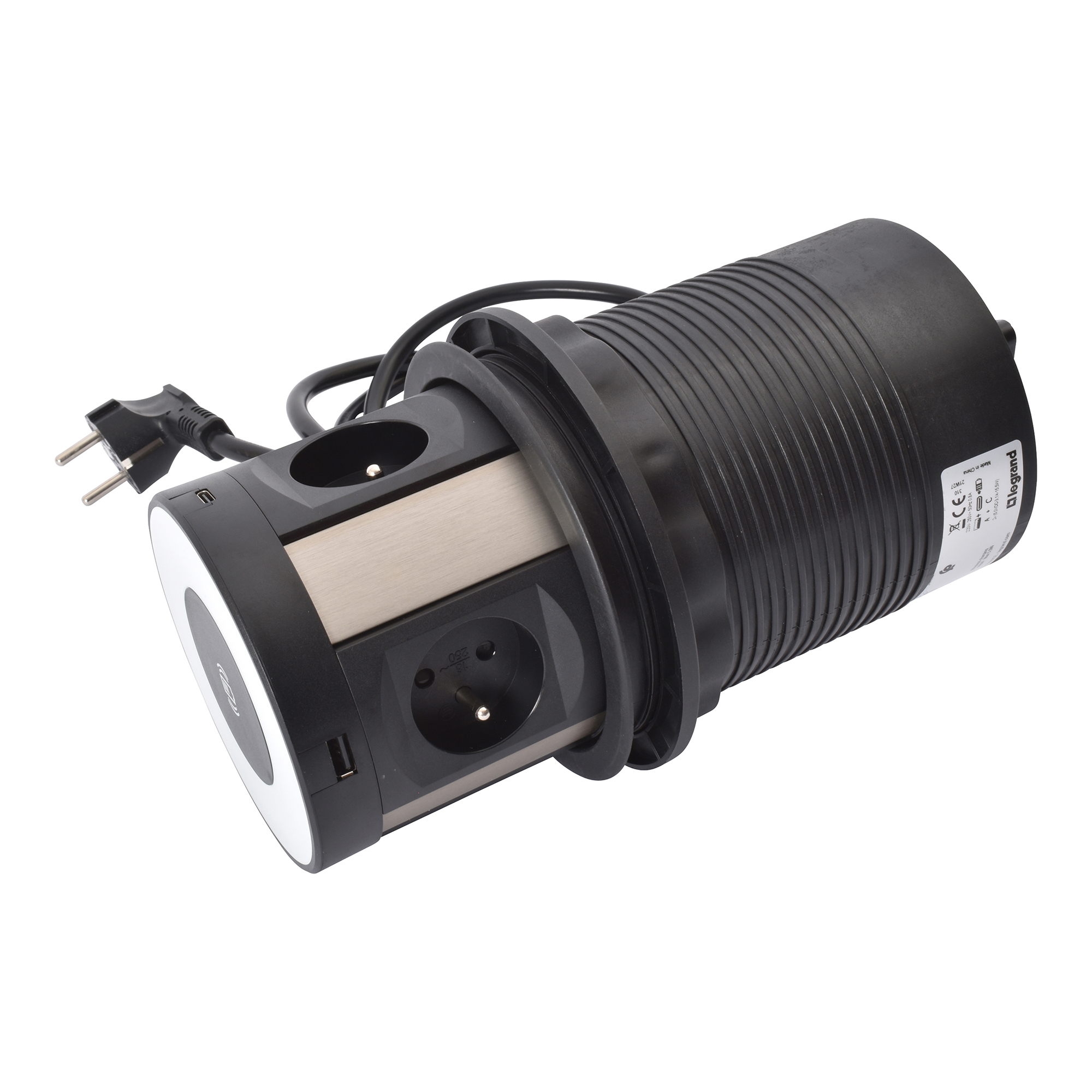The Incara™ Tower 120 outlet is a retractable flush-mounted solution that offers 4 electrical outlets, 4 USB chargers, and 1 wireless charger, providing complete electrification at 360 degrees for modular workstations or meeting tables.