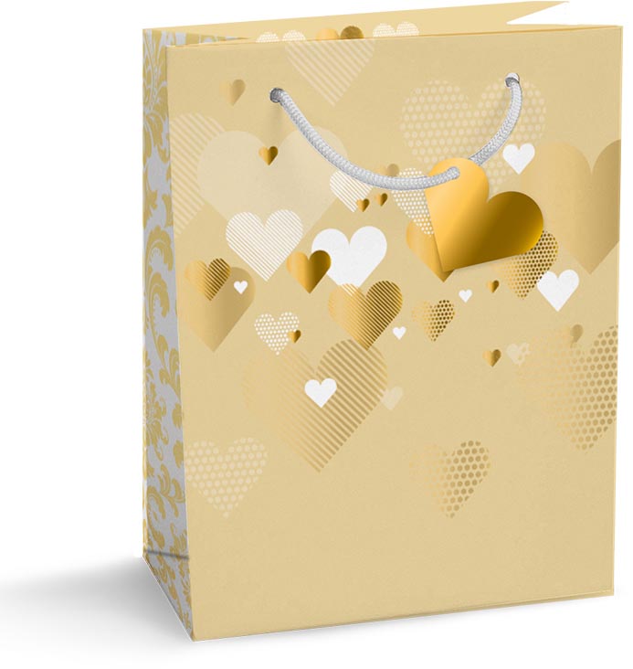 Motif: sac champagne avec coeurs en or et blanc Avec étiquette inscriptible