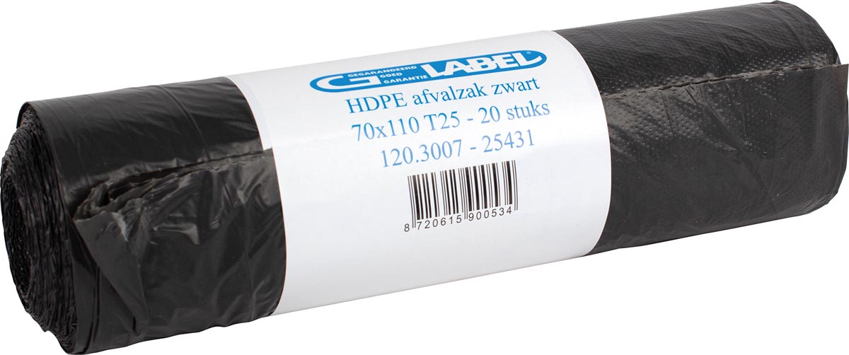 Detailled descriptionFt 70 x 110 cm Capacité: 120 l Matériau: HDPE recyclé Couleur: noir 19 microns Rouleau de 20 pièces