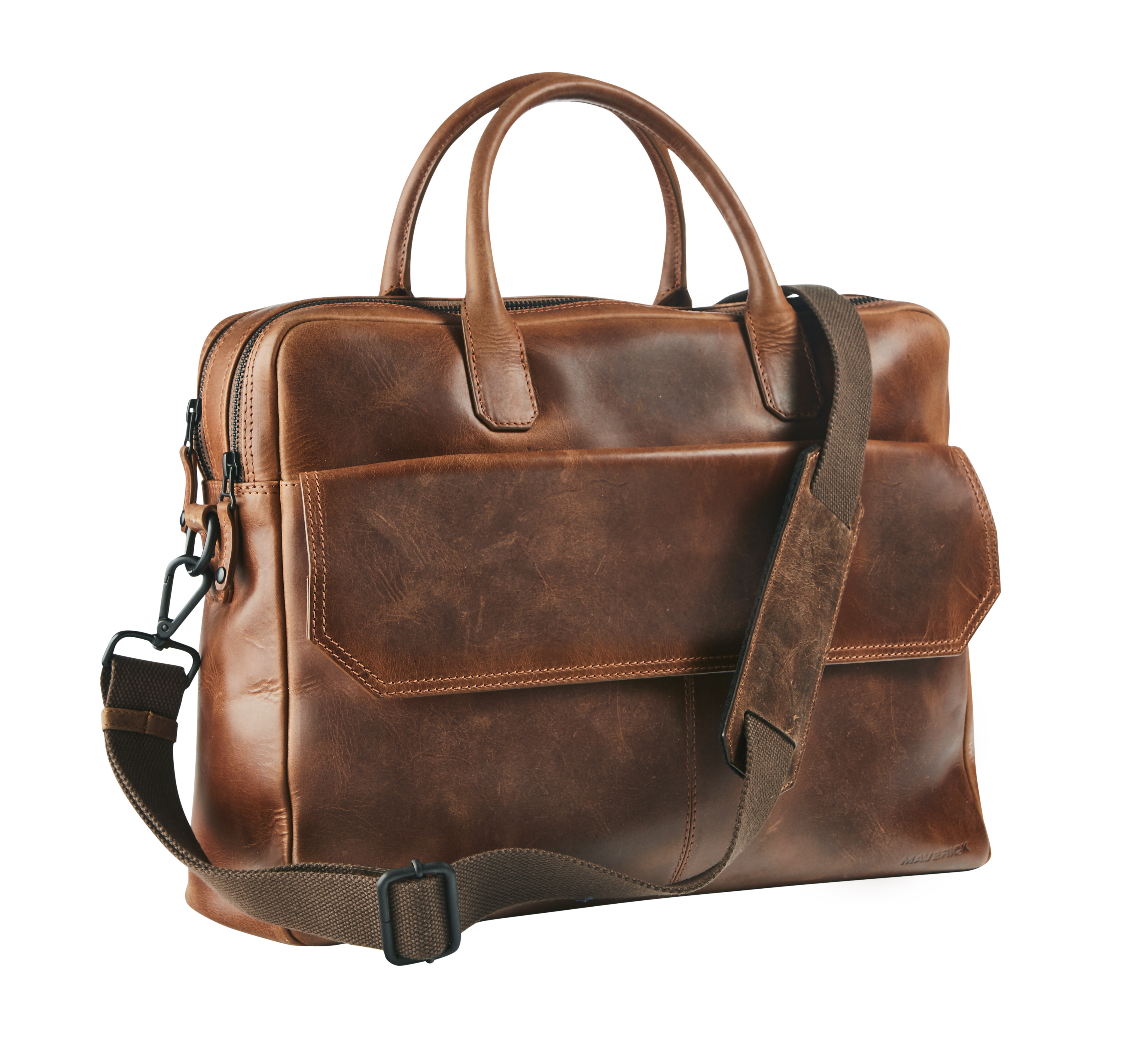Cuir de vachette pleine fleur, cuir à tannage végétal - ordinateur portable 15'6"" (taille max. 37 x 25 cm) - 2 compartiments principaux - organisateur interne - compartiment facile d’accès. Bandoulière amovible - sangle pour fixation à un trolley. Dimensions 41x10x30cm. Brun