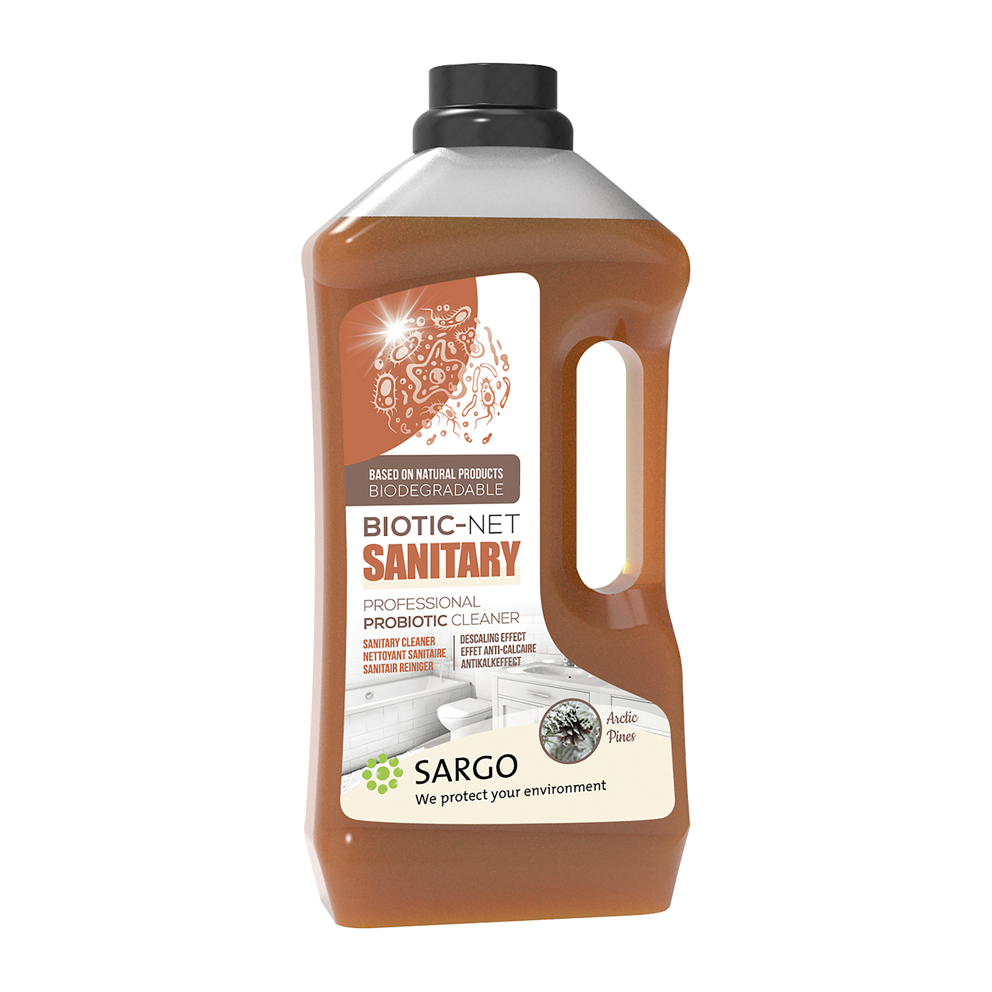 Nettoyant sanitaire probiotique très efficace pour éliminer rapidement et en toute sécurité les salissures quotidiennes dans les sanitaires, éviers, toilettes, douches, etc. Biotic-net Sanitary est sûr à utiliser, écologique et biodégradable. Facilement biodégradable avec pH neutre. Empêche la formation de calcaire. Parfum frais et agréable de pins de l’Arctique. Contient plusieurs souches bactériennes spécifiques formant des enzymes qui décomposent la saleté organique. Ultra concentré: 0,4% de concentration 40 ml pour 10 L d’eau), donc utilisation 2,5 à 10 x plus longue vis à vis autres marques.